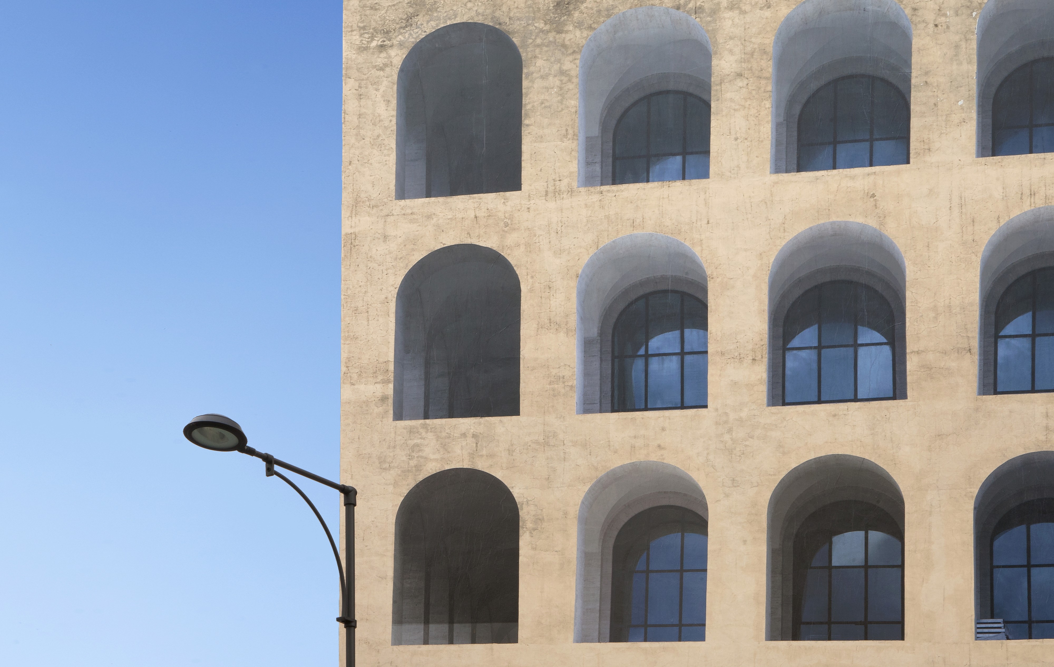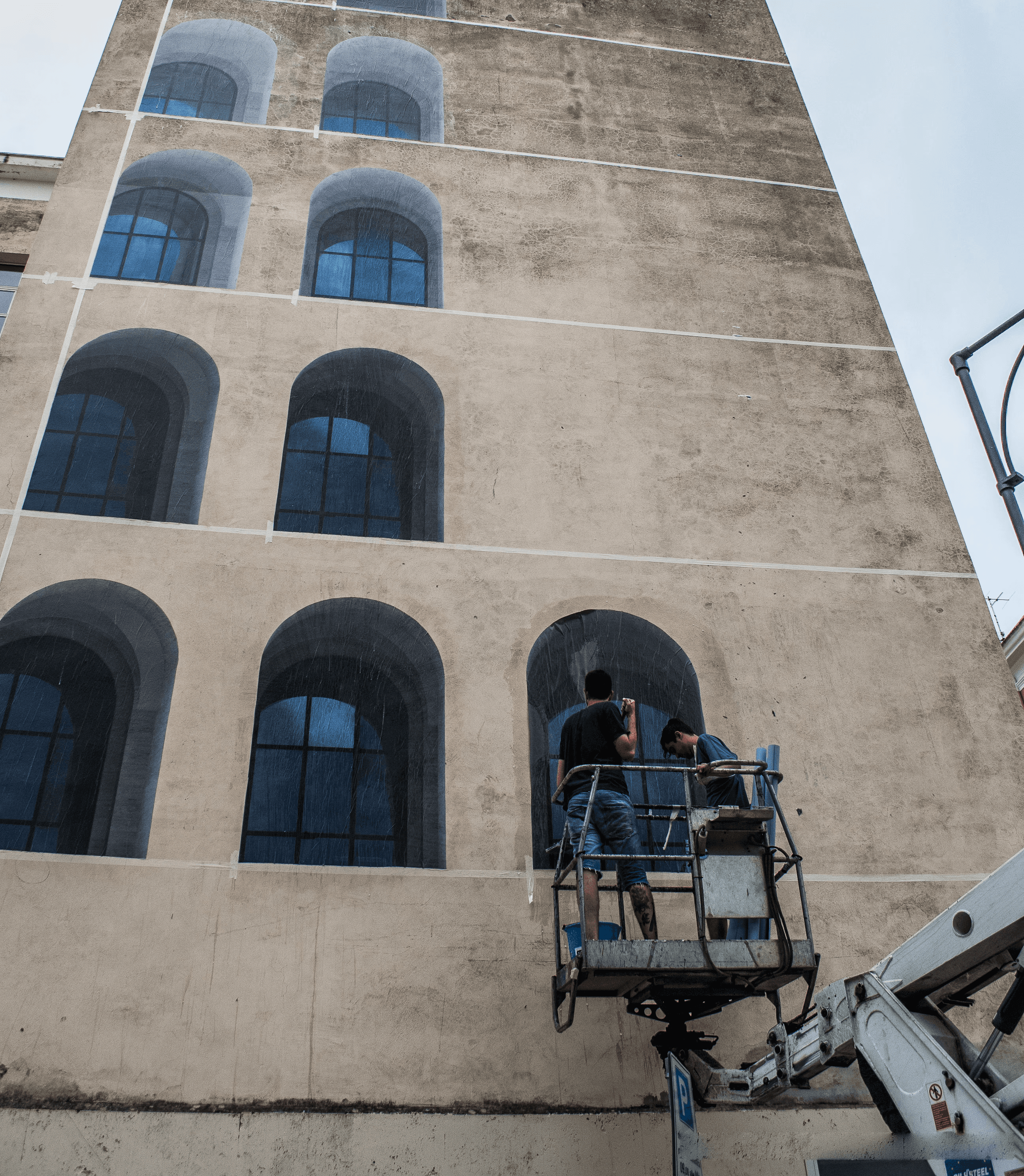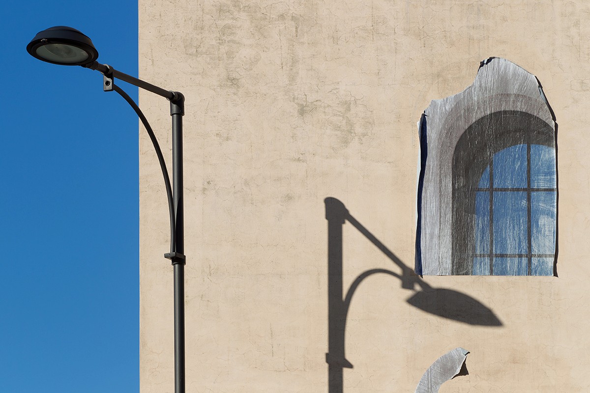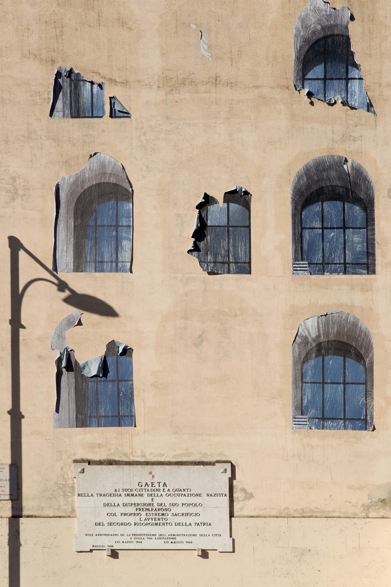Guardando dall’esterno la scuola Silvio d’Amico di Gaeta ci si rende conto subito che siamo davanti a un chiaro esempio di architettura razionalista. Per questo si è deciso di intervenire sulle superfici delle due torri laterali del suo frontespizio con l’esemplare classico degli archi del Palazzo della Civiltà Italiana (noto anche come Palazzo della Civiltà del Lavoro) che usa gli stessi codici architettonici della struttura scolastica.?Ma, in realtà, l’intervento mostra qualcosa che va oltre questa intenzione. Il lavoro di trasposizione vuole suggerire la nascita della scuola stessa attraverso una cesura ridotta del monumento rappresentato.