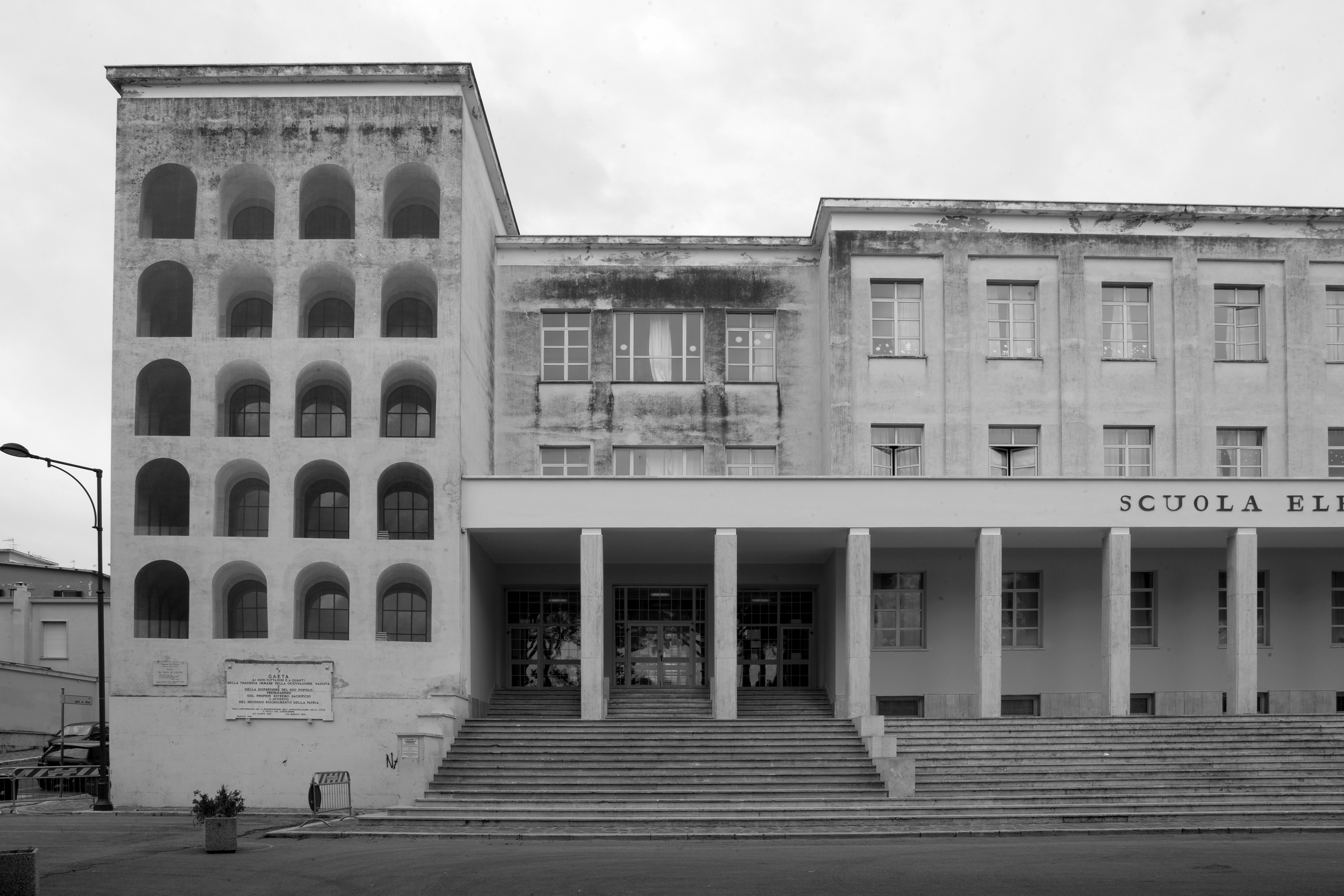 opera di arte pubblica di sbagliato che ripropone una rivisitazione del palazzo della civiltà italiana, sulla scuola elementare di Gaeta