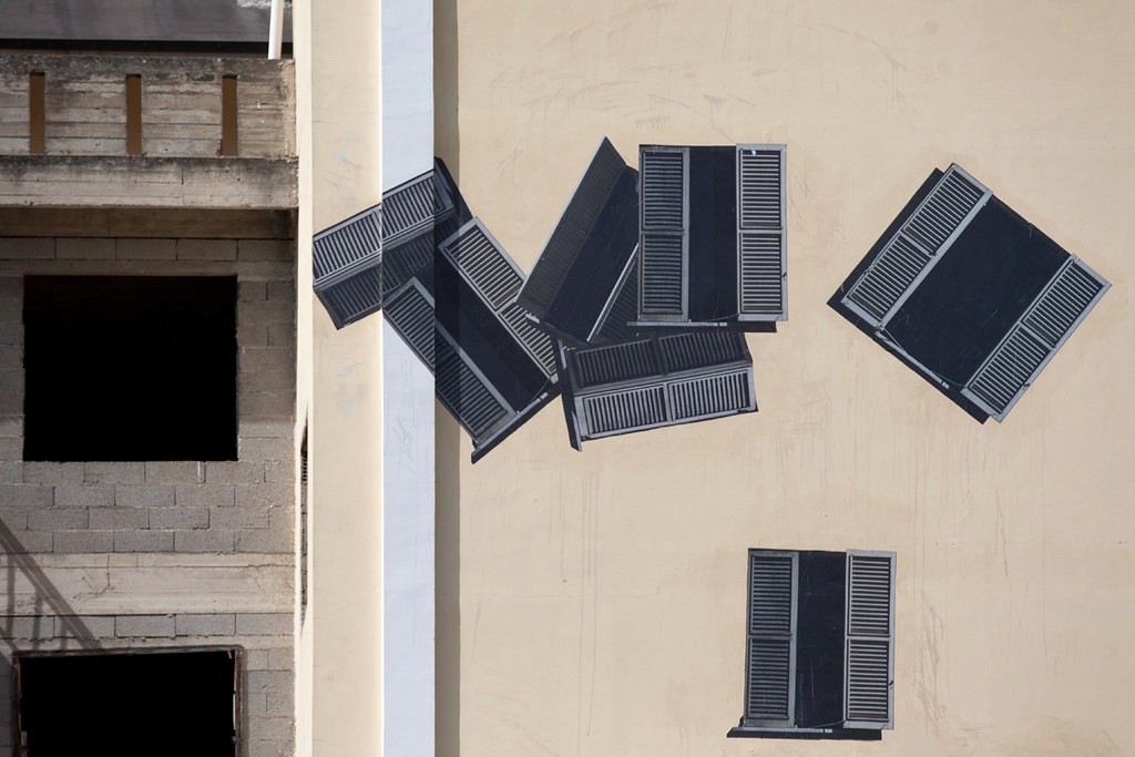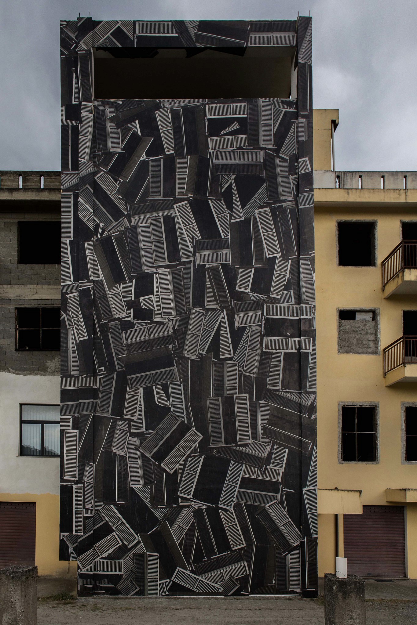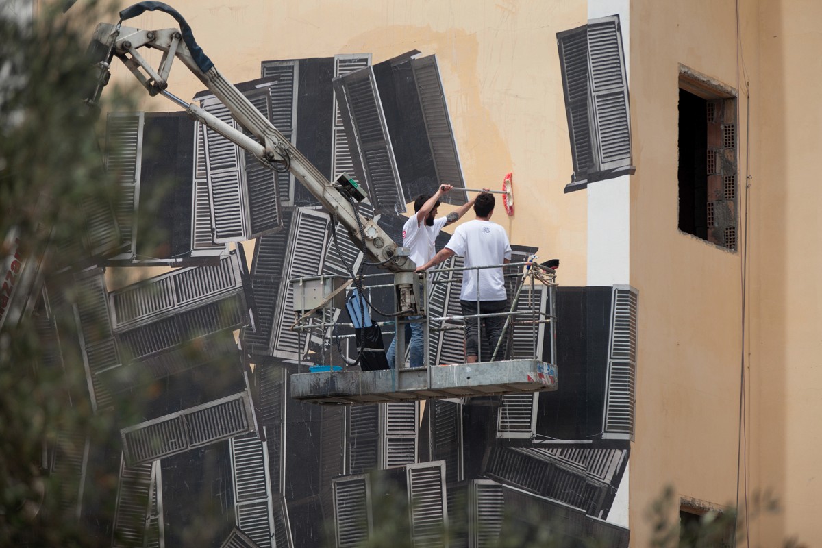 Lavoro inedito per composizione, tecnica e dimensioni per il collettivo Sbagliato, che per Abstractism esplicitano la loro natura concettualmente astratta. Attraverso la moltiplicazione e l’affissione dell’iconica persiana tramite collage su muro, l’opera, concepita in una zona ad alto rischio sismico, rimanda alla situazione sociale nella quale si trovano le nuove generazioni, che vivono con la terra che continuamente trema sotto i loro piedi.